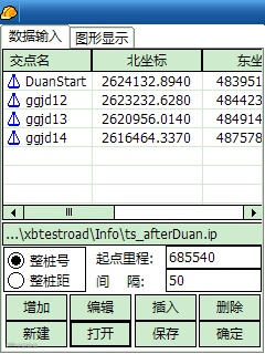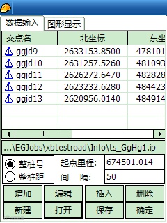 新建的贺广段道路文件ts_gghg1.ip,按直曲表输入交点。注意:不要忘记输入起点里程;间隔表示计算时每隔多少距离计算一个逐桩坐标。