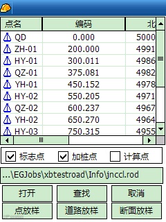 保存计算成功后,进入测量——道路放样——道路放样库,打开贺广道路文件。注意,保存后,ip会生成同名的rod文件,道路放样时都是打开rod文件。