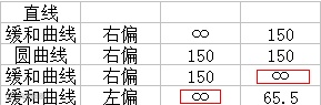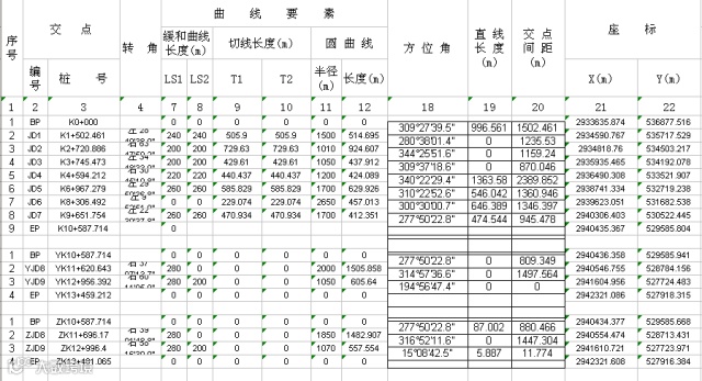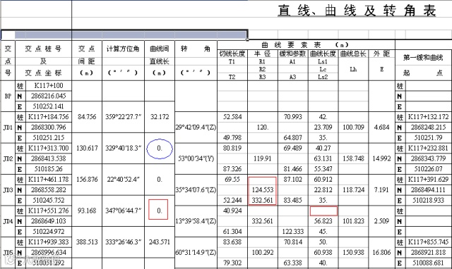 标准的直曲表,起点(BP)和终点(EP)下,半径、缓曲长等参数,都是没有的。