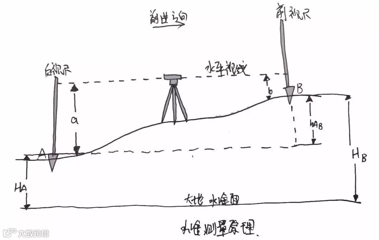 原理:利用水准仪提供的水平视线对竖立在两点之间的水准尺进行观测,并通过其中一个点(A点)的高程推算另一个点(B点)的高程。