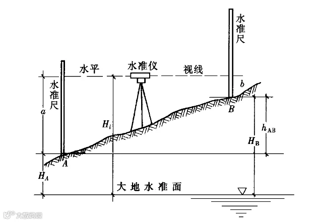 水准测量的原理是利用水准仪提供的“水平视线”,测量两点间高差,从而由已知点高程推算出未知点高程。