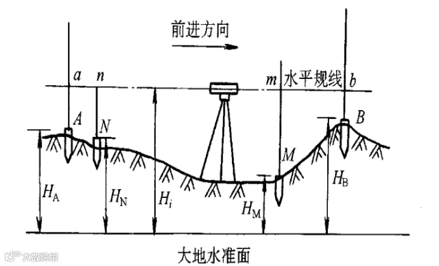 上式中iH是仪器水平视线的高程,常称为仪器高程或视线高程。仪高法是,计算一次仪高,就可以测算出几个前视点的高程。即放置一次仪器,可以测出数个前视点的高程。 综上所述,高差法和仪高法都是利用水准仪提供的水平视线测定地面点高程。