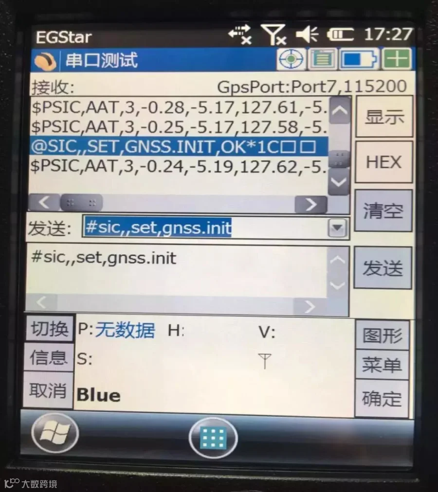 工程之星打开蓝牙连上主机——点击工具——点击串口调试——选择“#sic,,set,gnss.init”命令——点击“发送”,迅速点“显示”,找到提示“@SIC,,SET,GNSS.INIT,OK”即为刷新历成功。如下图: