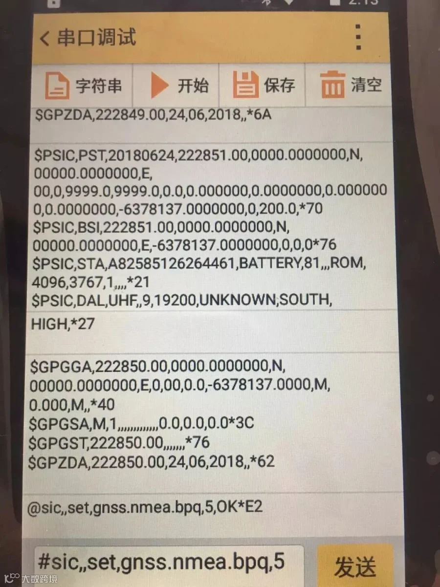 工程之星打开蓝牙连上主机——点击工具——点击串口调试——选择“#sic,,set,gnss,nmea,bpq,5”命令——点击“发送”——迅速点击“暂停”,找到提示“#sic,,set,gnss,nmea,bpq,5,OK”即为刷星厉成功。如下图: