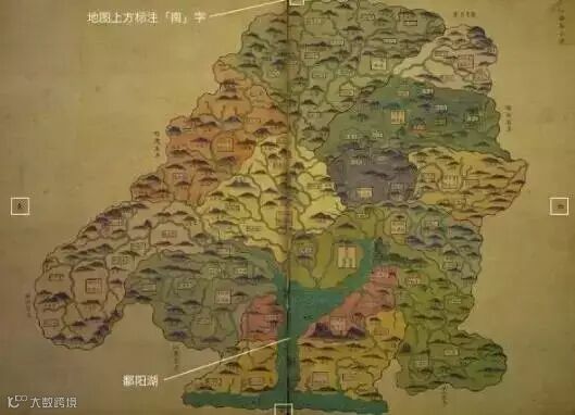 与现代地图“上北下南、左西右东”的惯例不同,中国古代地图并没有这方面的制图限制。「江西省舆图」采取的便是上南下北,左东右西的设定,所以鄱阳湖位于地图底部: