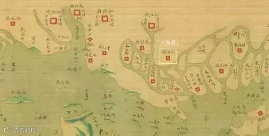 图中上方为黄色陆地,下方为绿色海洋,上西下东,以方块、圆圈、菱形等不同符号标注行政区划分。把头右倾45度看图,是不是立刻就对那时的「上海县」地形熟悉了一点?完整的「口隘全图」里记录了沿岸山河、港口、暗礁等情况,重要之处写有行船须知、海防守则等细节。这也体现了中国古地图多文字说明的特点。