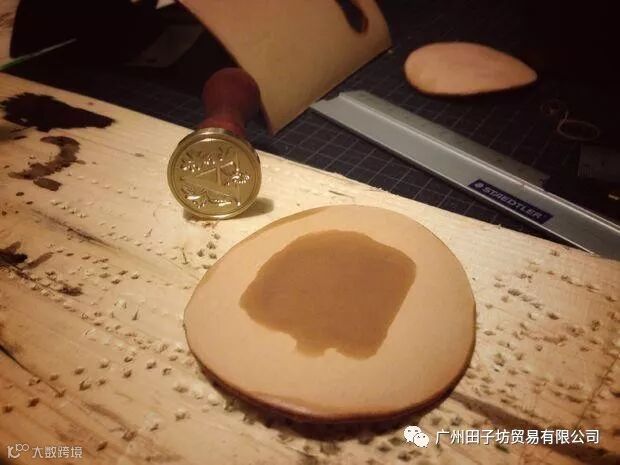 冲压标志:滋润皮革和邮票标志就可以了。我用蜡邮票和老虎钳添加一些压力。几分钟后,对其做。