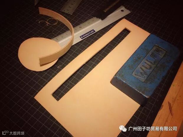 切矩形和两个圆形块。使用模板或画上了皮革测量。测量两次,切割一次。(我的测量23厘米×12厘米)