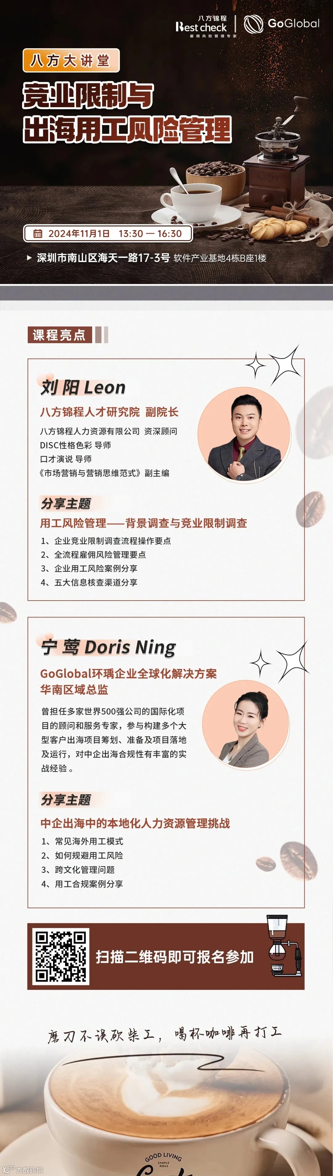 为了帮助企业人力资源管理者更好地应对这些挑战,八方锦程联合GoGlobal将在11月1日于深圳举办一场主题为“竞业限制与出海用工风险管理”的活动。
