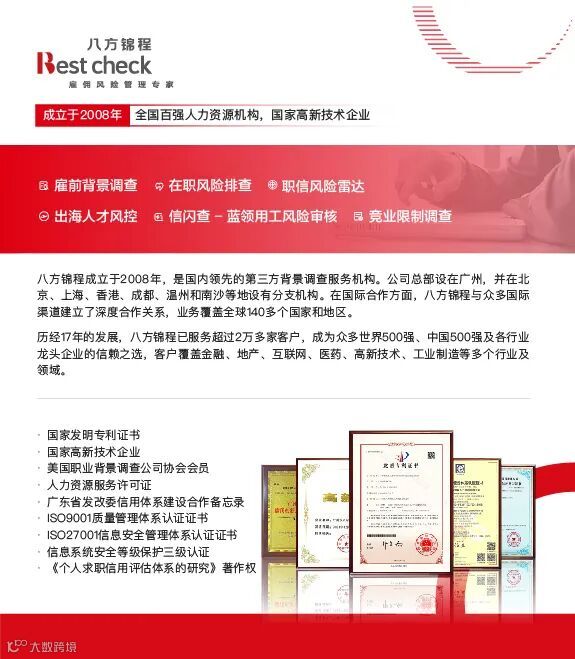 入职背景调查是风险防控的第一道关口。八方锦程依托丰富的全球网络资源和专业的法律团队,可为出海企业提供目标国家的背调服务,帮助企业识别候选人潜在风险点。这种前置性评估能够帮助企业避免“先出海,后整改”的被动局面,为后续用工管理奠定坚实基础。