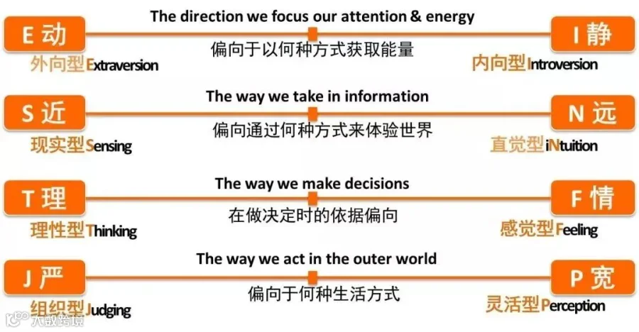 这个指标以瑞士心理学家荣格划分的8种类型为基础,加以扩展,形成四个维度: