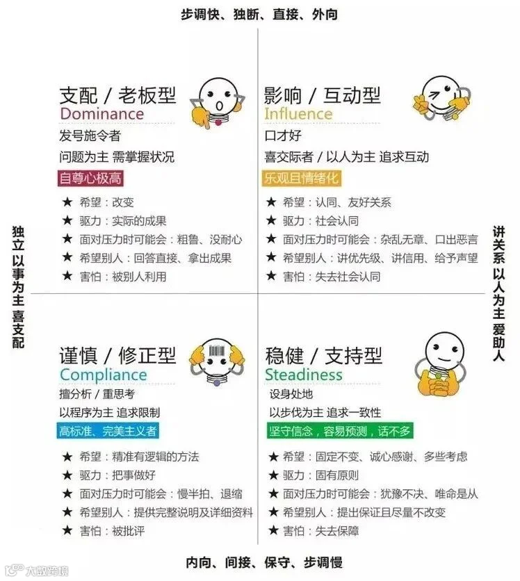 DISC个性测验最初是为了测量人的情绪反应,将人格分为四大类型: