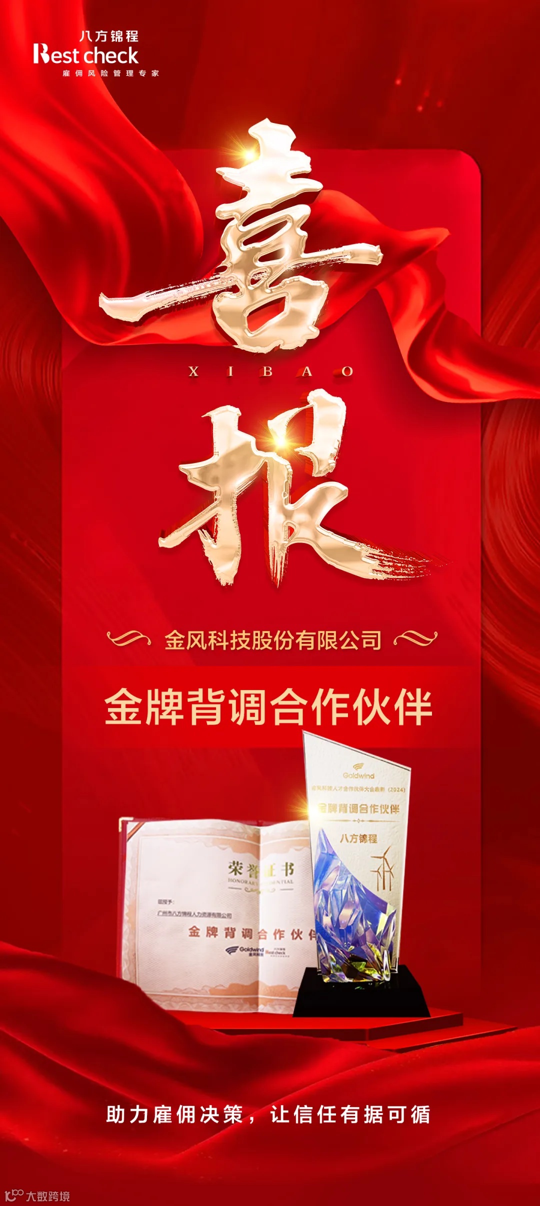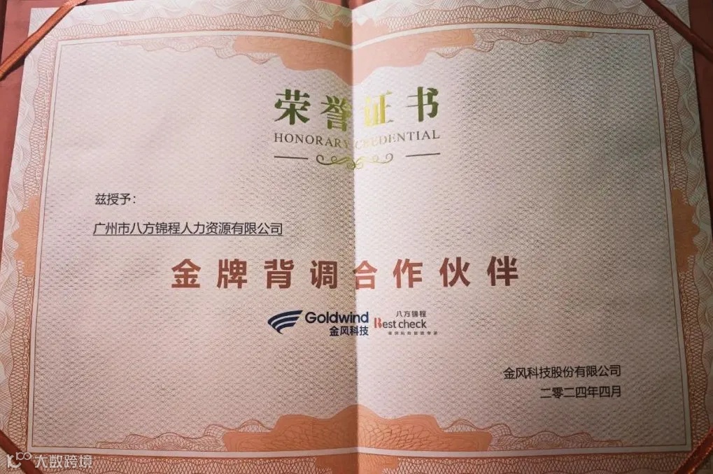 4月23日,八方锦程荣获金风科技“金牌背调合作伙伴”称号,证明了客户对八方锦程在服务质量、项目经验、客户服务等方面表现的高度认可。