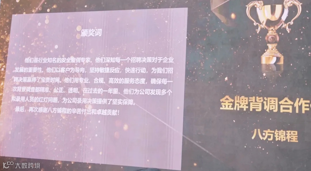 正如颁奖词中所说,八方锦程作为中国背景调查行业头部企业,在15年的发展历程中,坚持以客户为中心,为全行业客户提供优质的雇佣风险防范方案,助力企业在激烈的人才市场竞争中取得主动权。