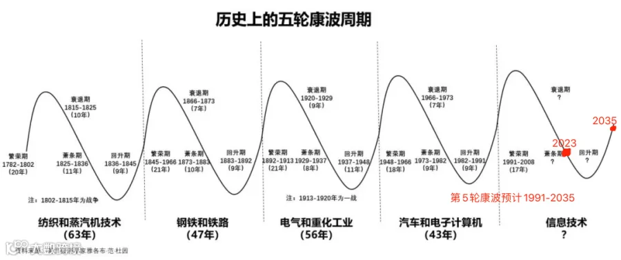 康波周期的四个阶段包括:繁荣期、衰退期、萧条期、复苏期。从近20年的情况看,我们已经进入历史上第五轮康波周期的衰退阶段。