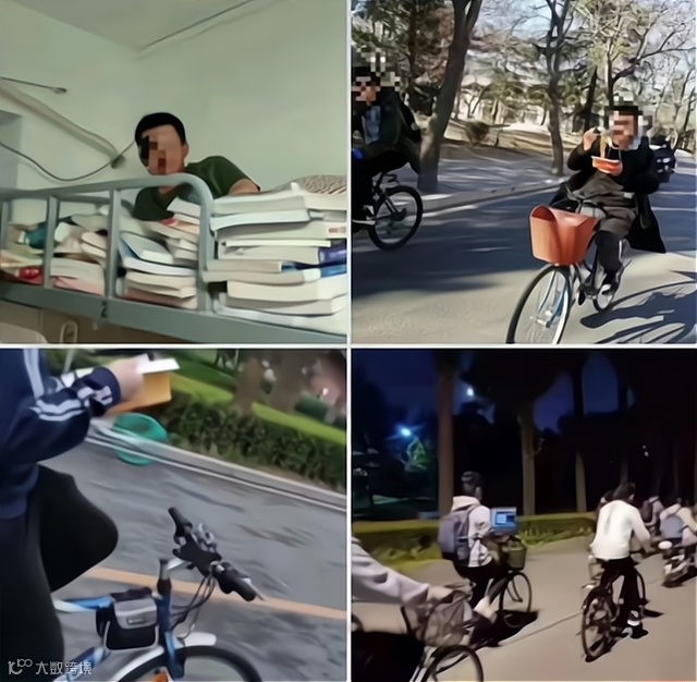内卷最早出于几张照片:有人骑自行车看书,有人宿舍床上铺满一摞摞的书,有人骑车端着电脑写论文……