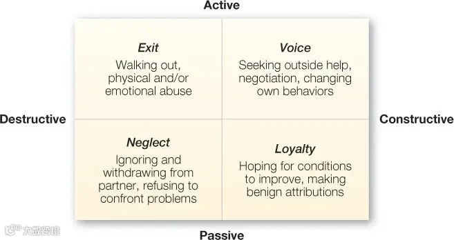 经济学家赫希曼将所有这些方式系统地整合到了一个模型中,在他的经典著作《退出、言论与忠诚:对企业、组织和国家衰退的回应》中按照“积极-消极”和“建言-沉默”的两个维度提出: