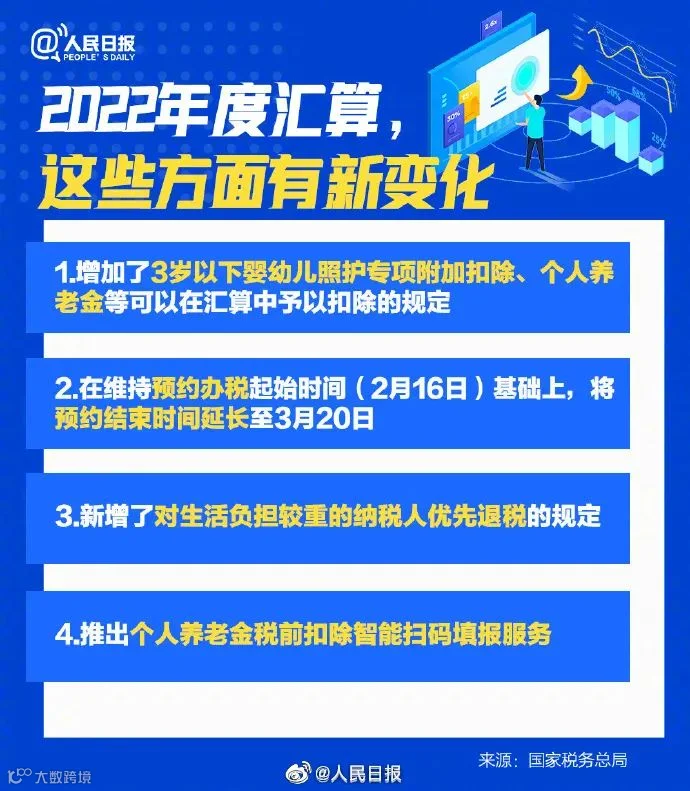 2022年度个税汇算于今起开始纳税人如需在3月1日至3月20日之间办理年度汇算可在2月16日至3月20日每天的早6点至晚22点登录手机个人所得税APP进行预约2022年度退补税怎么办理?2022年度汇算新变化又有哪些?