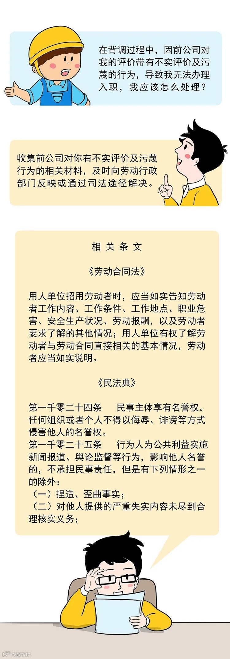 在背景调查过程中,如因前公司的不实评价及污蔑的行为导致你无法办理入职的,可以收集前公司对你有不实评价及污蔑行为的相关资料,及时向劳动行政部门反映或通过司法途径解决。
