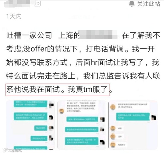 前段时间,有一位求职者在脉脉匿名发帖吐槽,自己在职面试了上海某家公司,HR在未经本人同意就擅自展开背调。