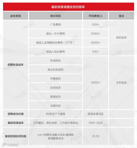 如果大家对17.50%、39.80%这些数值比例感觉很抽象,再给大家分享一下HR实际招聘场景中的雇前背景调查投资回报率(详见以下表格),这里可以看出,一个候选人的背景调查,帮助企业规避招聘成本风险上的回报率是背调投入的25.5倍。