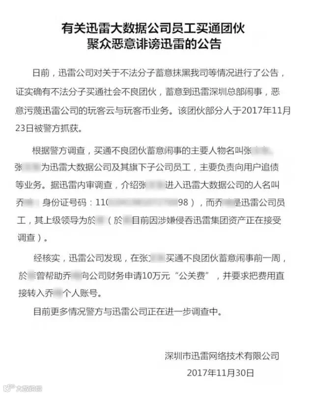 2017年11月迅雷大数据公司发布一则声明: