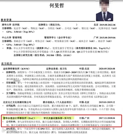 而从某位网友提供的个人简历看,他根本没去过普华永道实习,而普华永道的HR也证实了这一点。他的履历,是通过专门帮助别人包装简历的中介公司“包装”而成。