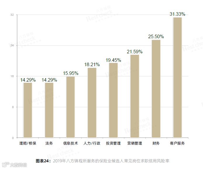 在保险业常见岗位的求职信用风险均在10%以上。客户服务岗位求职信用风险最高,占比为31.33%,其次,营销管理的求职信用风险占比21.59%。