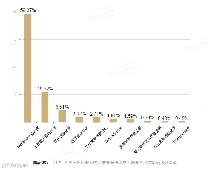 基于证券行业从业人员的“兼职”问题的存在,且大部分证券企业可能没有引起太大的重视。因此,企业在招聘过程中,忽略对“存在商业利益冲突”项目的核查,导致求职信用风险增加。