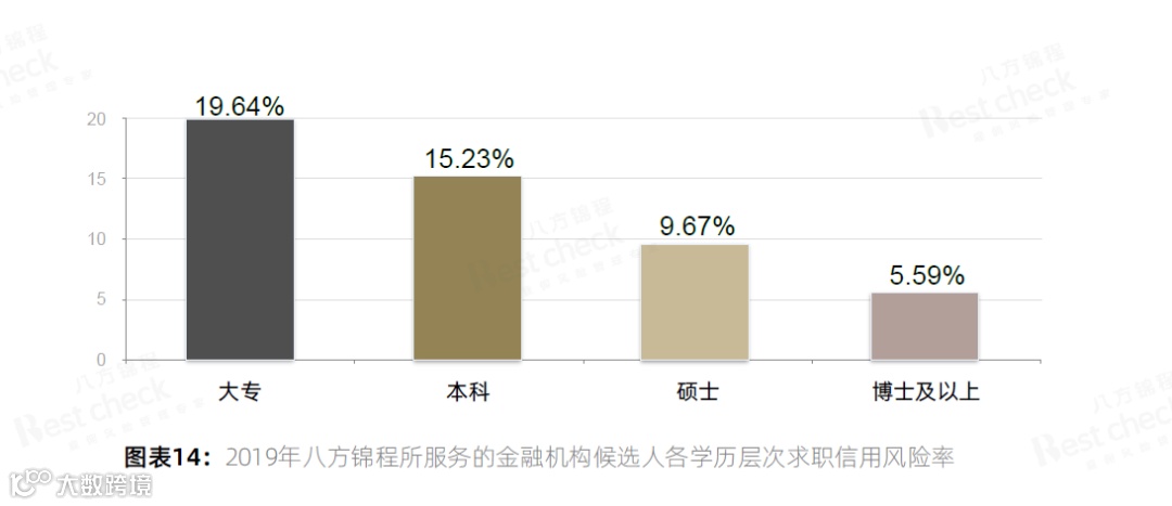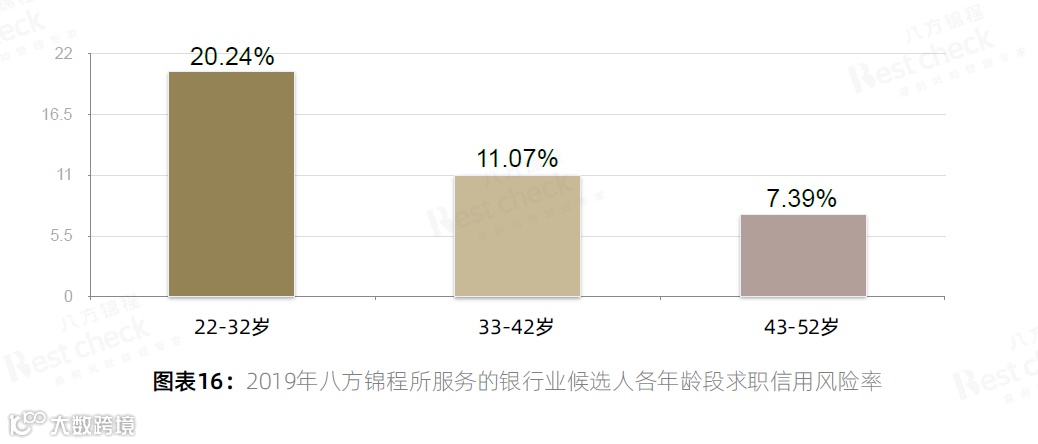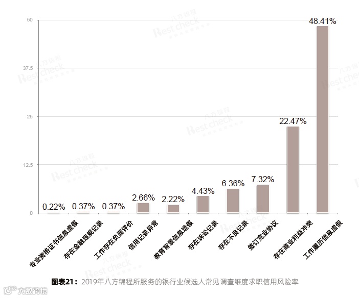 《报告》中显示,在金融机构中,2019年候选人求职信用风险率为13.19%,较2019年有所下降。但求职信用风险率的下降,说明了金融机构整体求职信用向好的趋势。