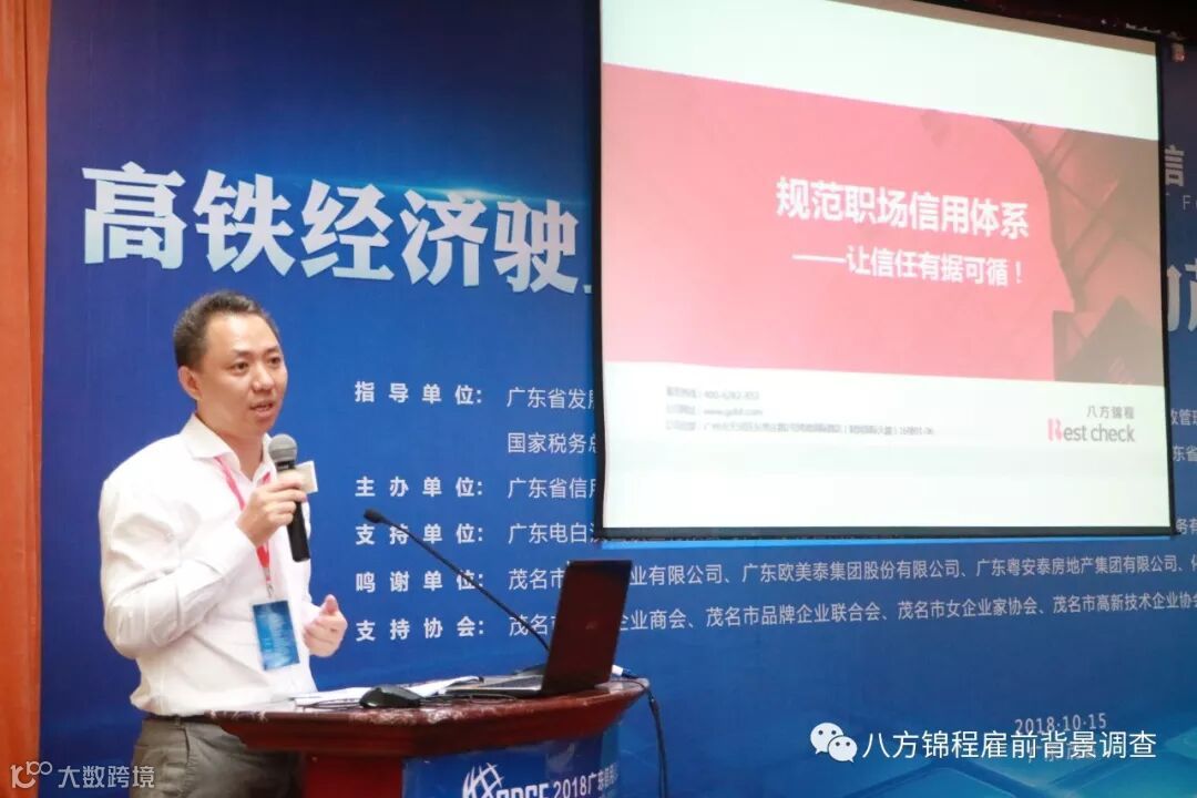 前言:2018广东信用论坛茂名分论坛隆重举行,八方锦程创始合伙人兼CEO、广东信用协会副会长刘朔婴先生作为信用机构代表受邀出席,并在论坛现场作关于“规范职场信用体系,让信任有据可循”的主题演讲,分享十年雇佣风险管理经验,倡导规范职场信用体系,普及八方锦程职业背景调查评估模型。