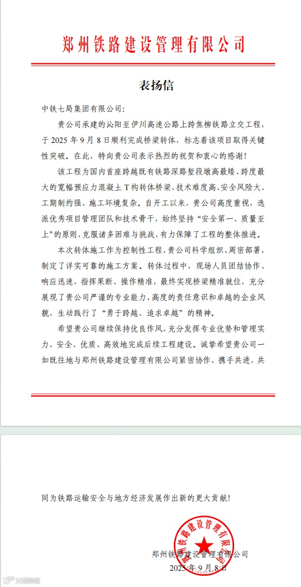 9月8日,历时100分钟,重达2.2万吨的桥梁结构在空中精准旋转83度,由郑州铁路建设管理有限公司代建、中铁七局集团有限公司承建的沁阳至伊川高速公路上跨焦柳铁路立交桥顺利完成转体对接。标志着项目关键控制性工程取得重大突破,为全线按期通车奠定了坚实基础。