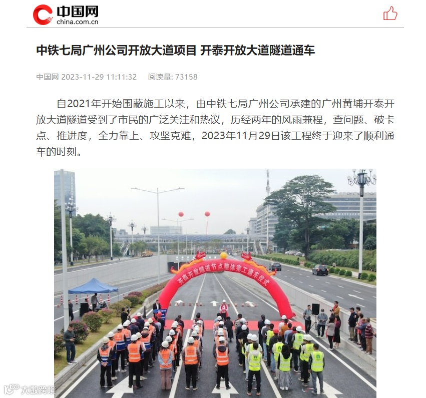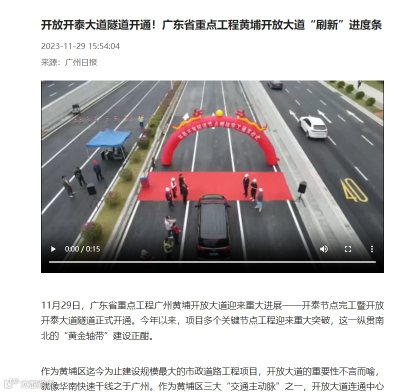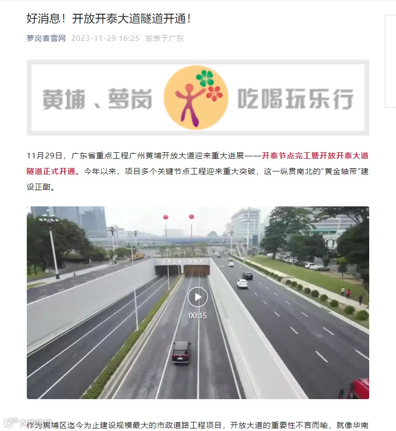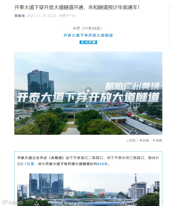 11月29日,广州市黄埔区开泰大道下穿开放大道隧道正式开通运行。