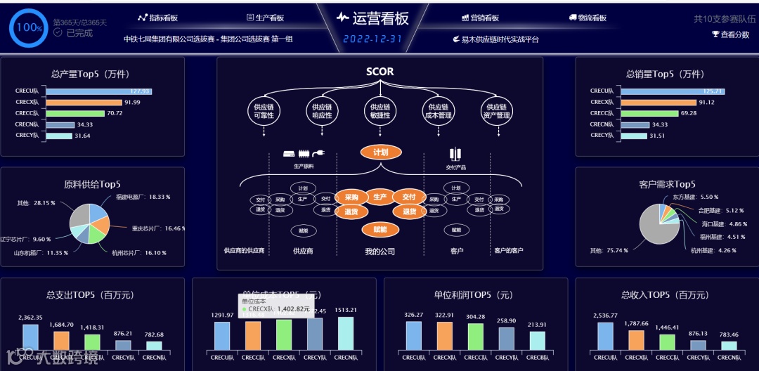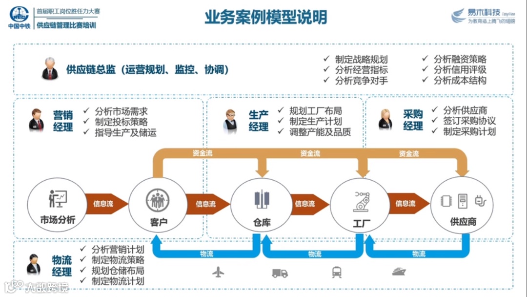 此次供应链管理比赛通过全国供应链管理职业技能竞赛所用的[易木供应链时代实战平台]进行。参赛人员使用比赛账号登录竞赛平台,模拟运营一家虚拟企业的供应链全过程。竞赛以平台设置的虚拟起始日期开始,参赛队员根据不同的角色分工,划分为运营总监、采购经理、物流经理、营销经理四个职位,共同运营一家虚拟企业。通过对市场热点、客户需求、供应商履约能力、流转资金分配以及区域配送等因素进行分析,确定供应链运营整体思路,从工厂选址、竞标投标、原料采购、成品加工以及仓储配送等形成完整的供应链运营体系。