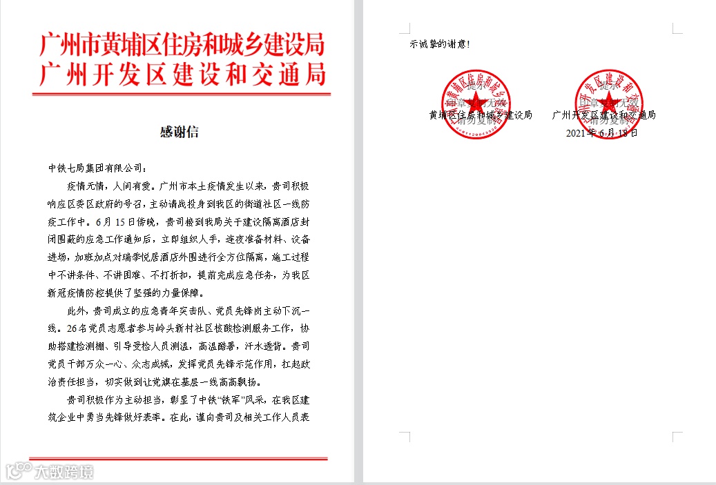 项目部以工程质量“确保省优 争创国优”为奋斗目标,充分发挥党员和先进模范的示范引领作用,不断增强团队的凝聚力和创造力,努力打造一支作风硬、素质高的项目团队。项目部以疫情为令,提高政治站位,强化责任落实,在做好自身疫情防控工作的同时,组建疫情防控志愿服务队,分批次、分阶段投入到广州抗击疫情的大潮,优质高效的完成广州防疫隔离酒店相关设施配套工程,受到地方政府的高度赞扬,树立了负责任、有担当的央企形象。