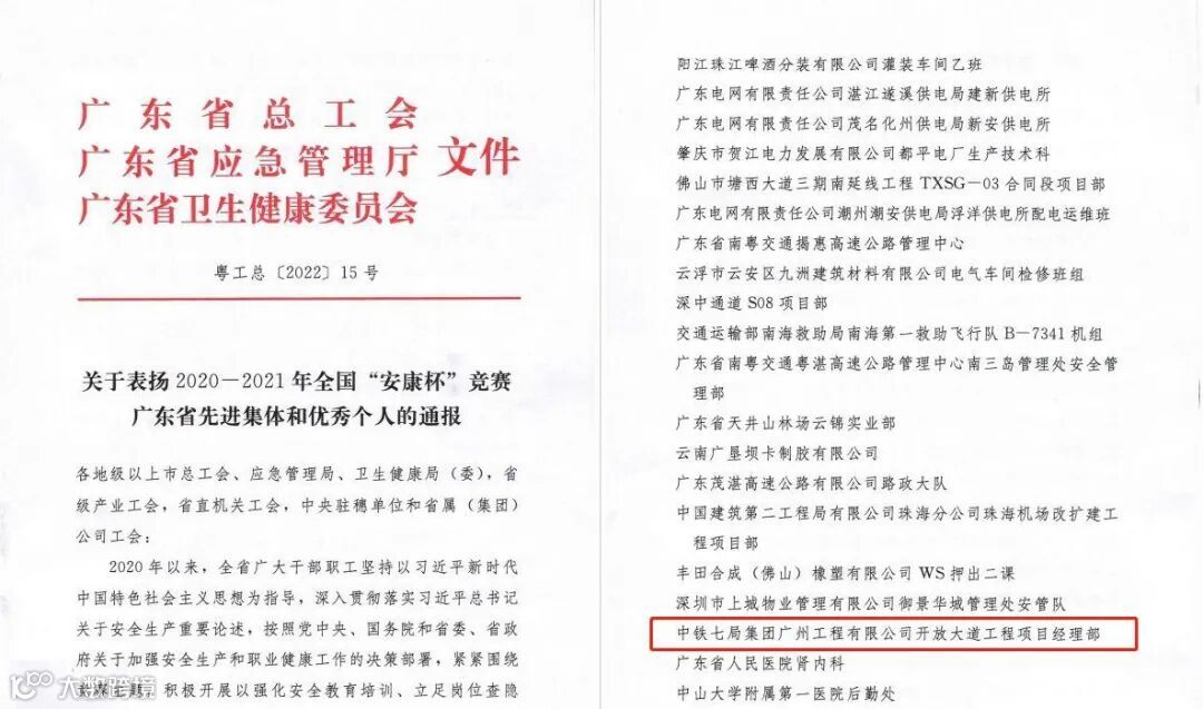 7月28日,中铁七局广州公司开放大道项目在2020-2021年度全国“安康杯”竞赛中荣获广东省优胜班组荣誉称号。