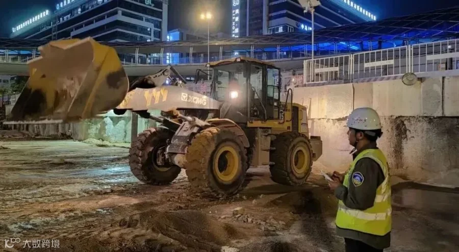 岗员夜间指挥机械安全施工并做记录