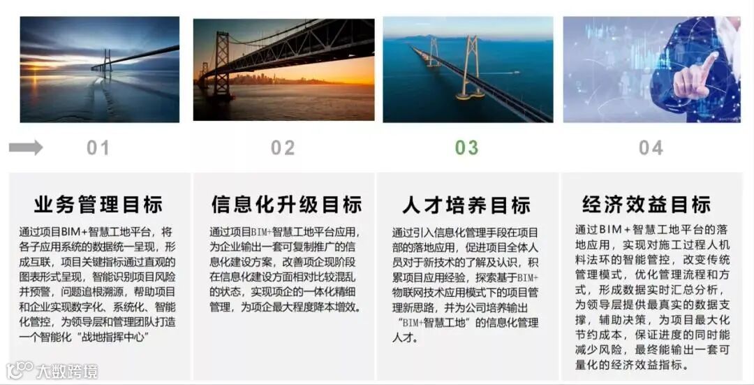 通过项目BIM+智慧工地平台应用收集汇总项目管理大数据,为企业输出一套可复制推广的项目管理实施方案,实现企业与项目的一体化精细管理。通过对项目人员的操作培训、实现业务替代,在大数据的基础上再进行优化,促进项目效益提升,同时输出一套标准流程,帮助企业培养一批管理型和应用型人才。通过管理制度、考核标准的数据积累,不断优化与完善系统建设方案、应用方案、应用标准等为项目领导层实现智能决策提供有力支撑。