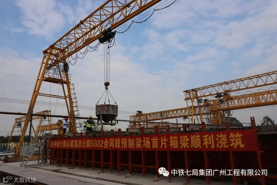 4月20日,经过3个小时的连续浇筑,中铁七局广州公司从埔高速项目SG02合同段顺利浇筑全标段预制梁场首片箱梁,标志着项目箱梁预制正式拉开帷幕。