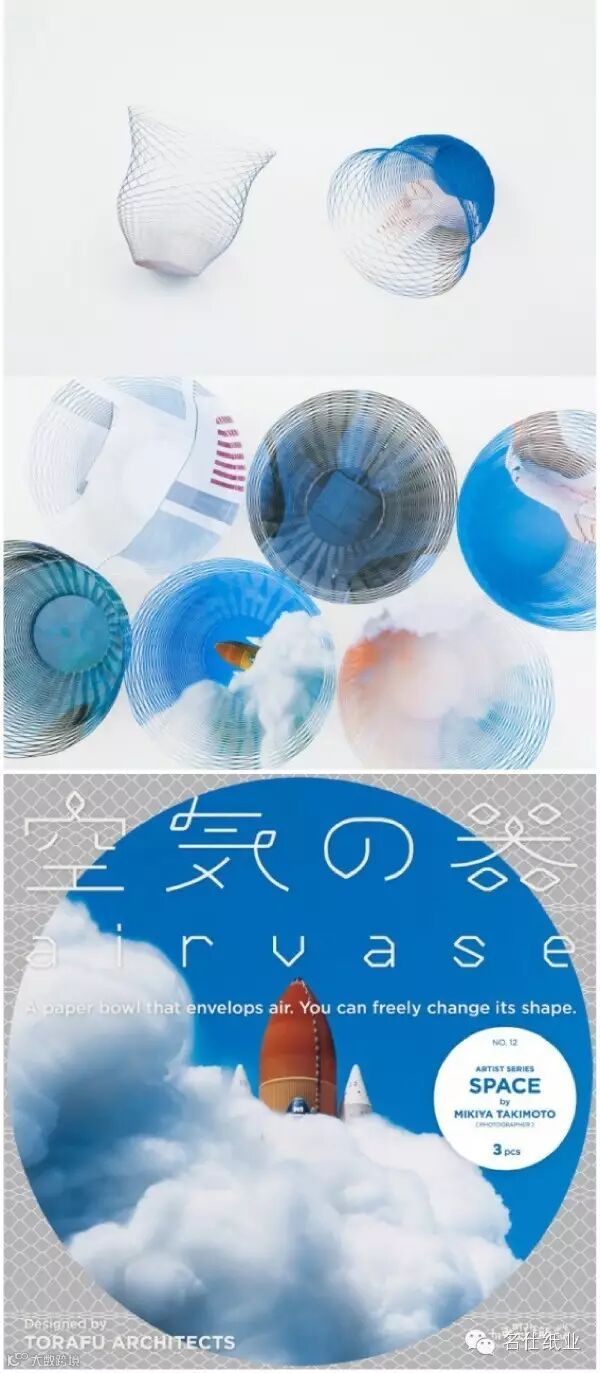 Torafu 工作室和 Mikiya Takimoto(平面设计)联手设计了一系列名为「太空」的剪纸空气花瓶,这些花瓶看上去只是一张圆形的纸片,上面有一圈圈的刻痕,沿刻痕打开,你可以把它拉成一个花瓶,高度由你决定,高度不同,视角不同,你看到的图案不尽相同。