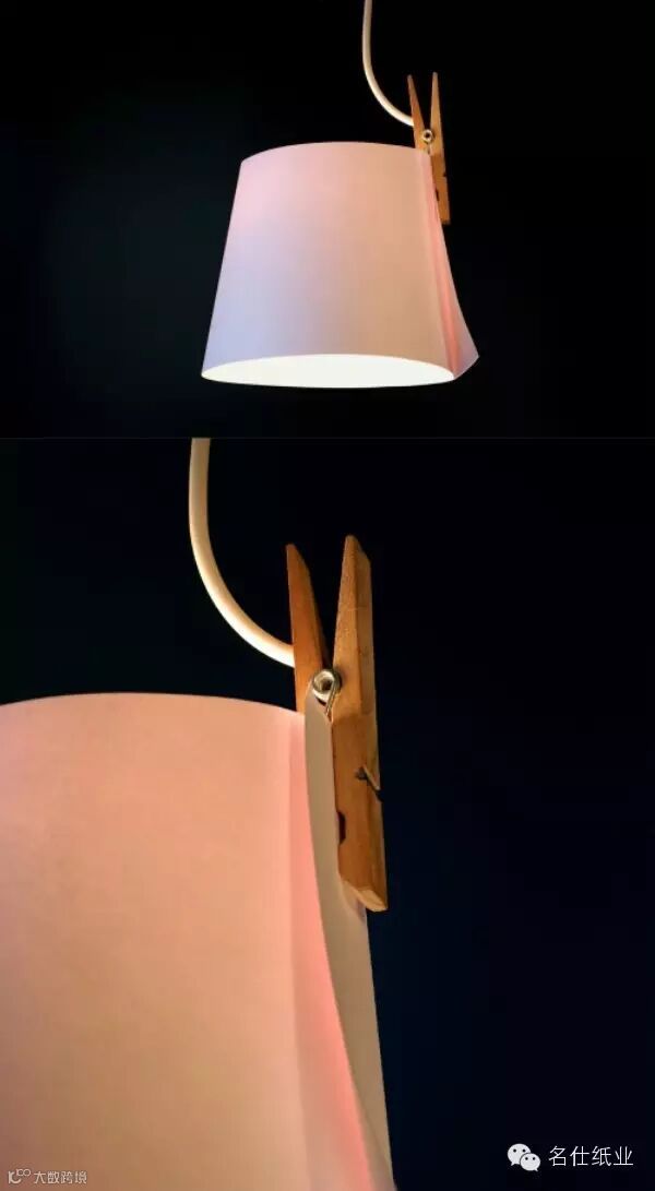 日本家具设计师山中一宏设计了一款名为「纸月亮」的极简吊灯,整个灯只由三部分组成:一个木头夹子,一张纸,和一个灯泡。使用时将纸卷成一个圆筒,用夹子夹住,罩在灯泡周围即可。