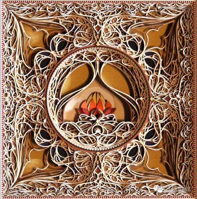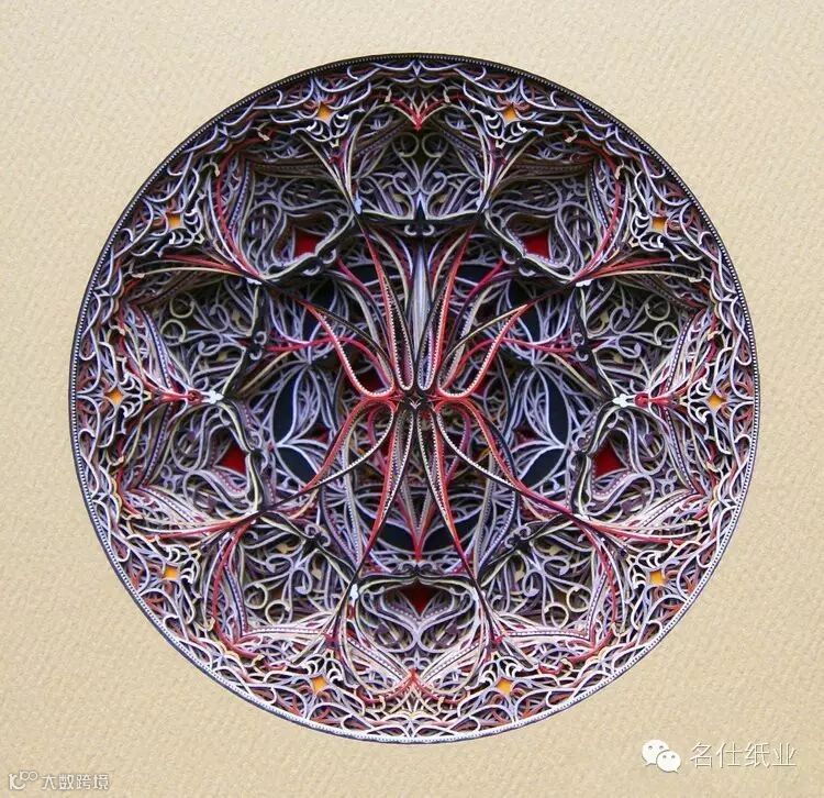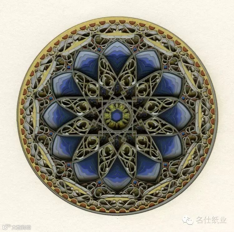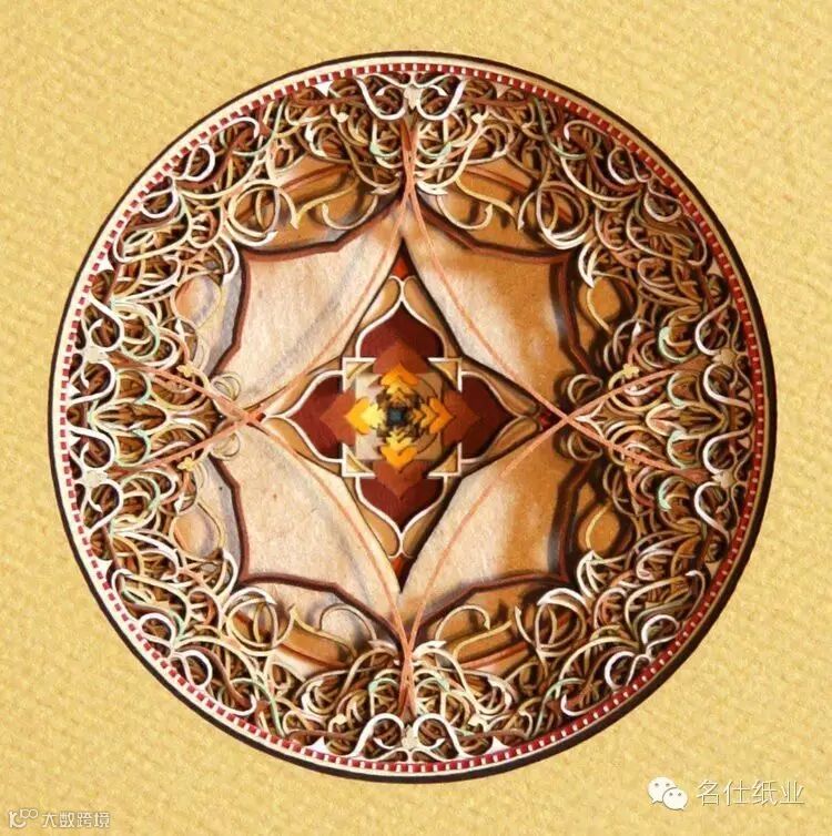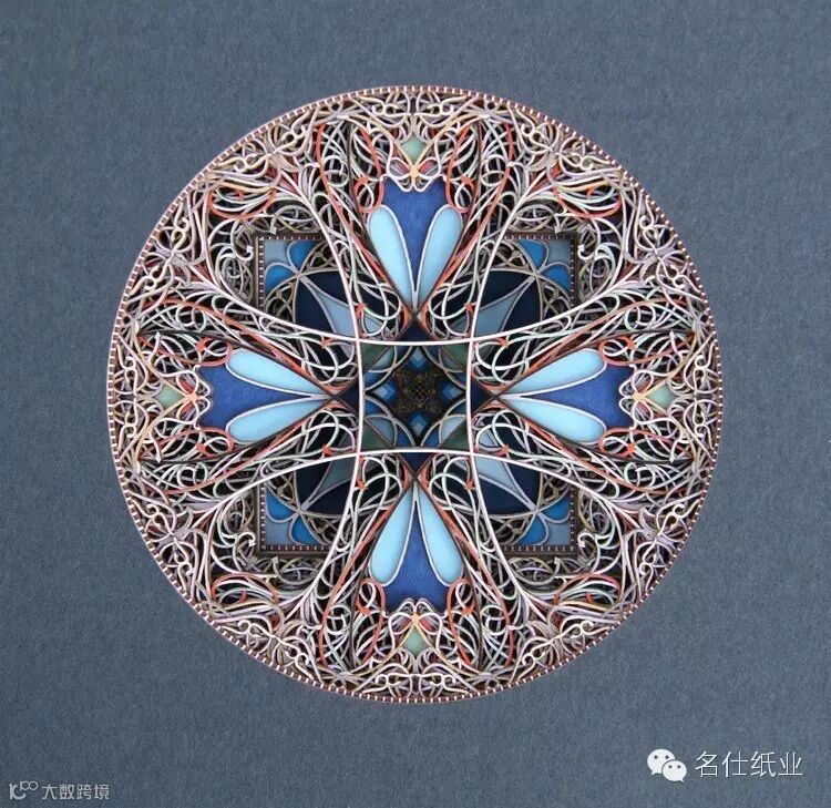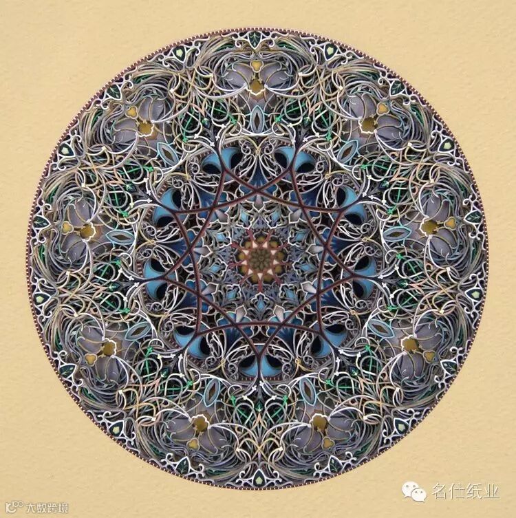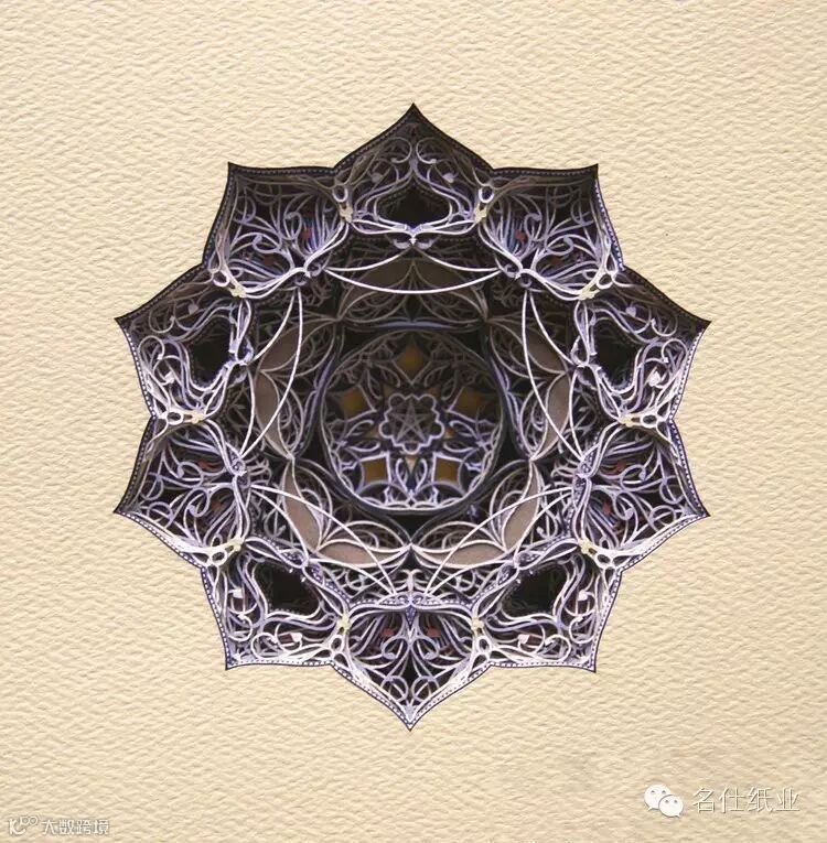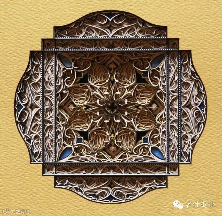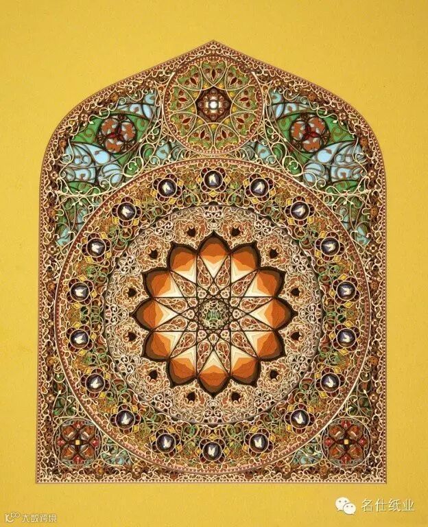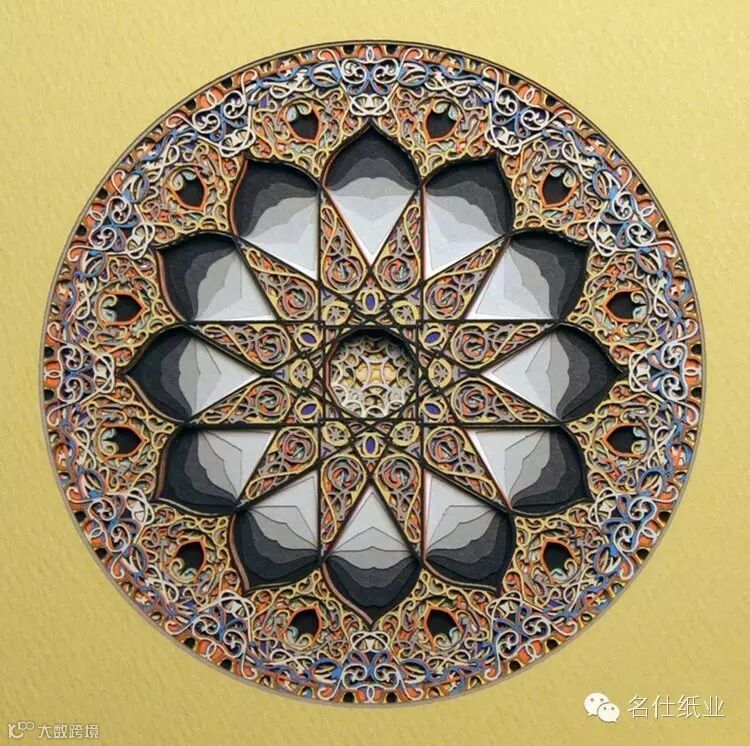 Eric Standley创造出的纸雕作品,多面而丰富,层层纸张合奏出色彩缤纷的斑斓。如此複杂精细的工作,要从各个面一一去检查、调整,才能达到预期的效果。他在创作时会先预想纸张跟纸张间堆迭产生的效果,这需要十分精密的计算,而结果是非常惊人的,线条的流畅和细腻充分展现出伊斯兰纹样的风格,且透过堆迭产生出立体深浅感,令人难以移开视线。