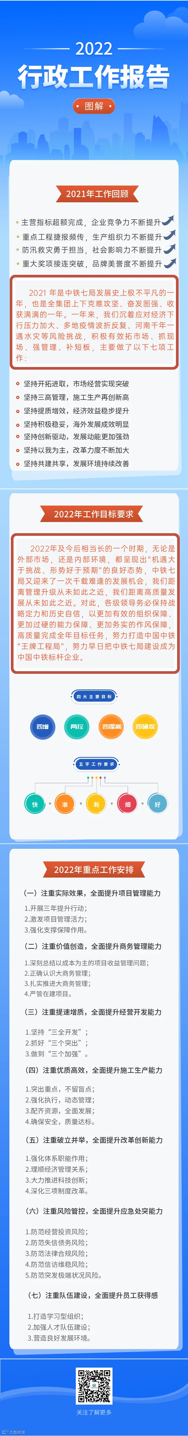 2月17日,中铁七局四届四次职代会暨 2022 年工作会顺利召开。总经理、党委副书记师建军作了题为《乘势而上 精准发力 推动企业高质量发展取得新成效》的工作报告,从“市场经营、施工生产、经济效益、海外发展、发展动能、企业改革、发展环境”等七个方面全面总结了2021年各项工作,结合企业发展形势,提出了“快”“准”“新”“细”“好”五字工作要求,并就做好2022年企业经营生产等重点工作进行部署,明确了七个方面的具体要求。报告中有哪些干货呢,一图让你读懂!