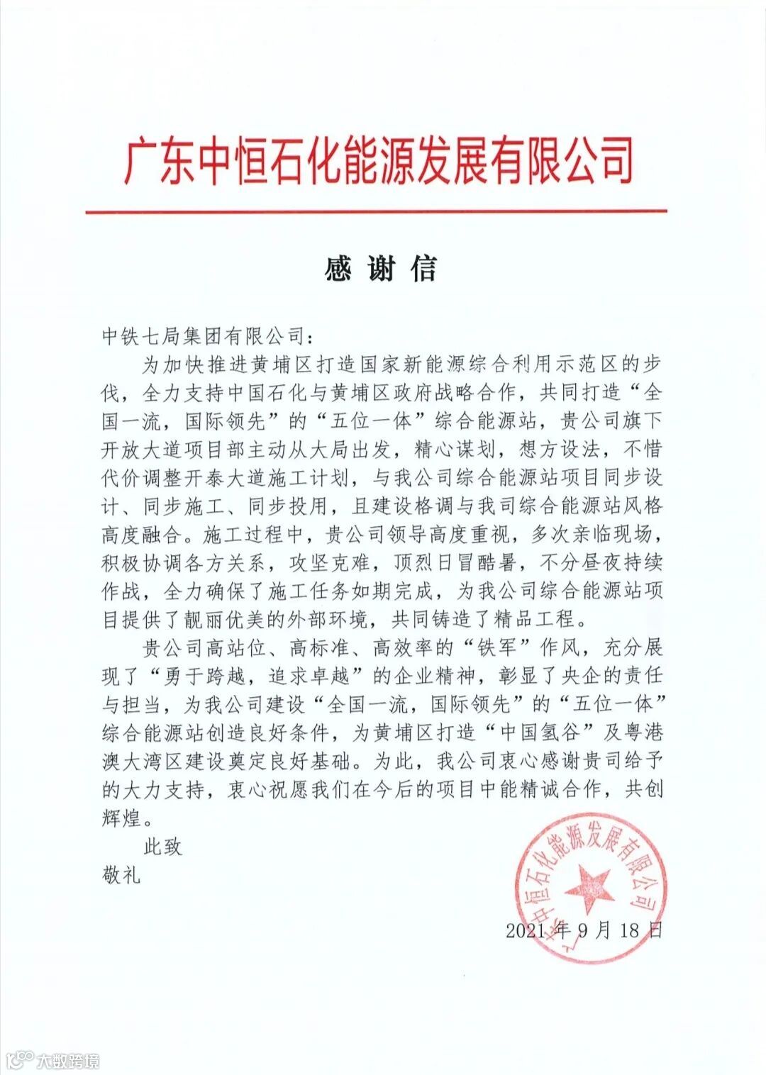广东中恒石化能源发展有限公司在信中表示,中铁七局开放大道项目主动从大局出发、精心谋划、想方设法,不惜调整开泰大道施工计划,高质量完成开泰大道与东明三路交叉口附近绿化工程,与综合能源站项目同步设计、同步施工、同步投用,且建设格调与综合能源站风格高度融合。为公司建设“全国一流,国际领先”的“五位一体”综合能源站创造良好条件,为黄埔区打造“中国氢谷”及粤港澳大湾区建设奠定良好基础。