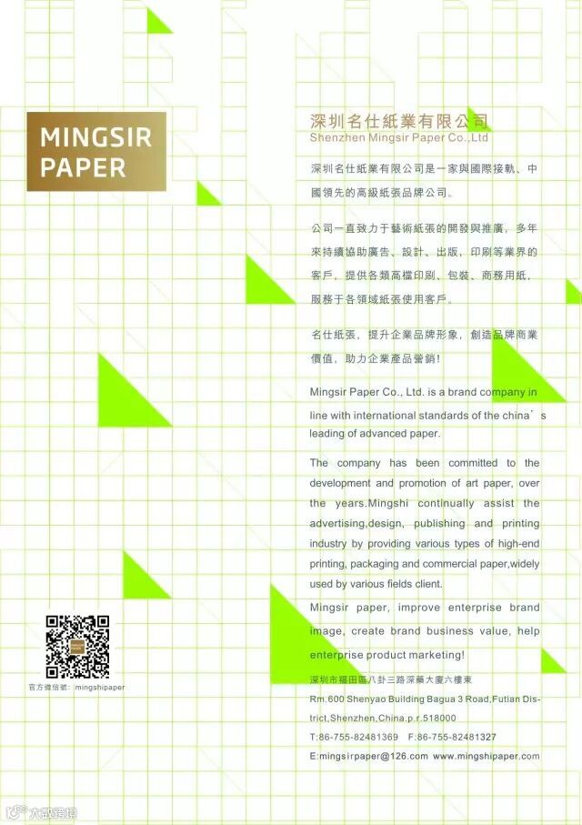 Mingsir名仕是中国知名的高级纸张品牌公司,致力于艺术纸张的开发与推广,集世界各地的高端特种印刷纸,服务于各领域的奢侈品牌。丰富的产品线,多元化的选择,尖端的品质。通过纸张帮助无数企业提升企业品牌形象,无论从产品或是口碑,都是纸张行业内当之无愧的爱马仕。