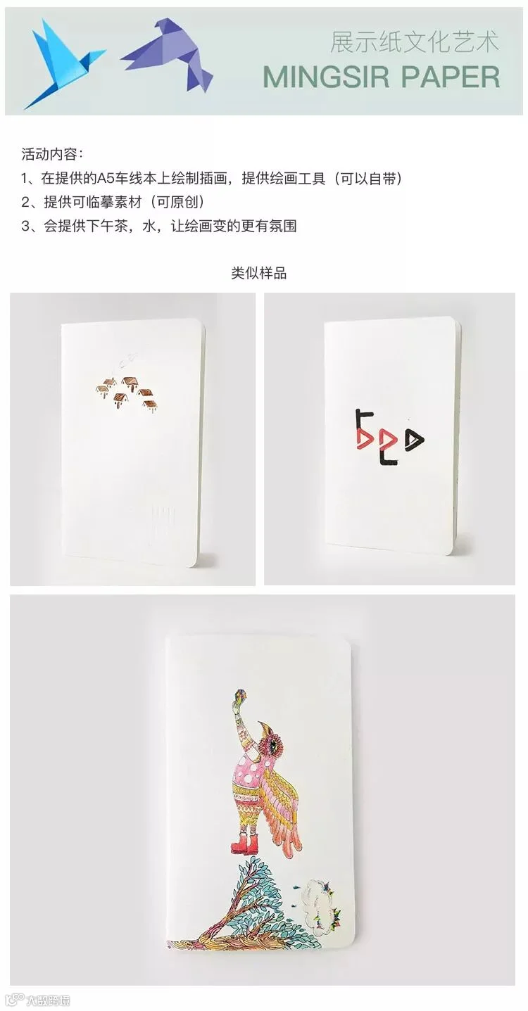 名仕纸业本期活动为手绘本封面绘制活动,活动的宗旨在于培养设计师的兴趣爱好,为宅在家里的你组织一些有意思的线下活动,我们将提供礼品和下午茶与大家一起分享,请大家将自己绘制好的素材自己好好保管。届时会有优秀作品展览及后期的个性化本子定制,制作的素材从作品当中选择,希望你有每天坚持的动力。