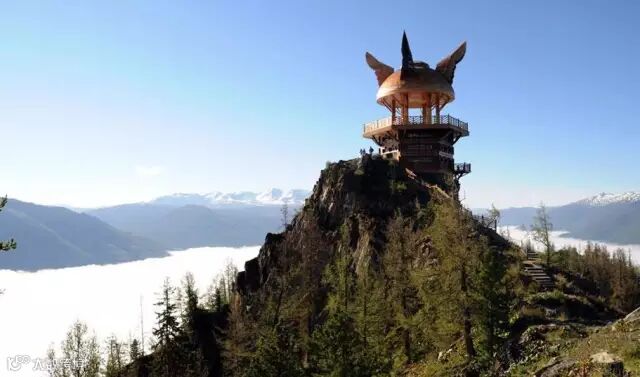 观鱼亭位于哈纳斯湖西岸骆驼峰顶上,观鱼亭的修建是为了能居高临下地观察湖中的“湖怪”,即俗称的大红鱼。虽然能看到大红鱼的人寥寥无几,但这里是俯瞰喀那斯湖全景的最佳角度。