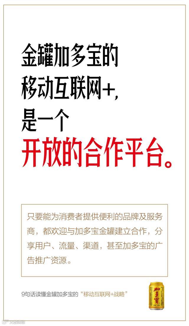 只要能为消费者提供便利的品牌及服务商,都欢迎与金罐加多宝建立合作,分享用户、流量、渠道,甚至加多宝的广告推广资源。