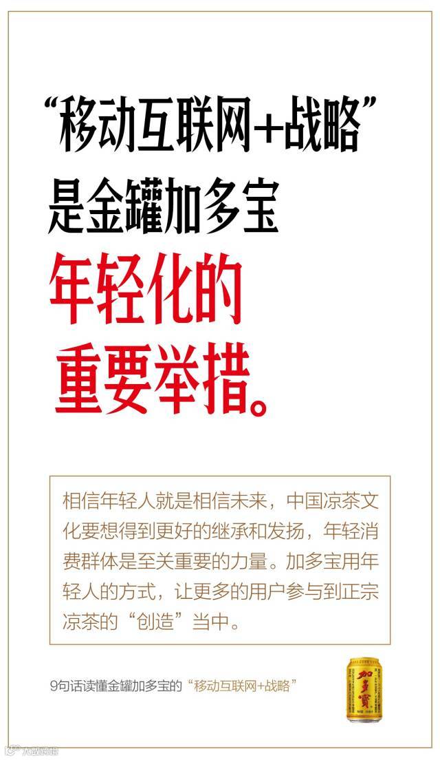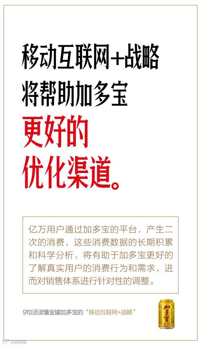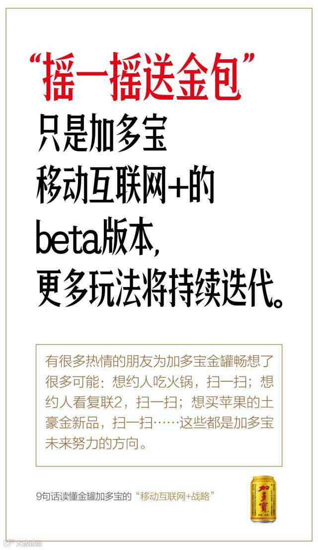 借助战略升级、推出金罐的契机,金罐加多宝率先启动“移动互联网+战略”,为行业探路。这种模式如果效果一旦显现,所有的快消品都可以把自己的“用户入口”,转化为互联网的流量入口。