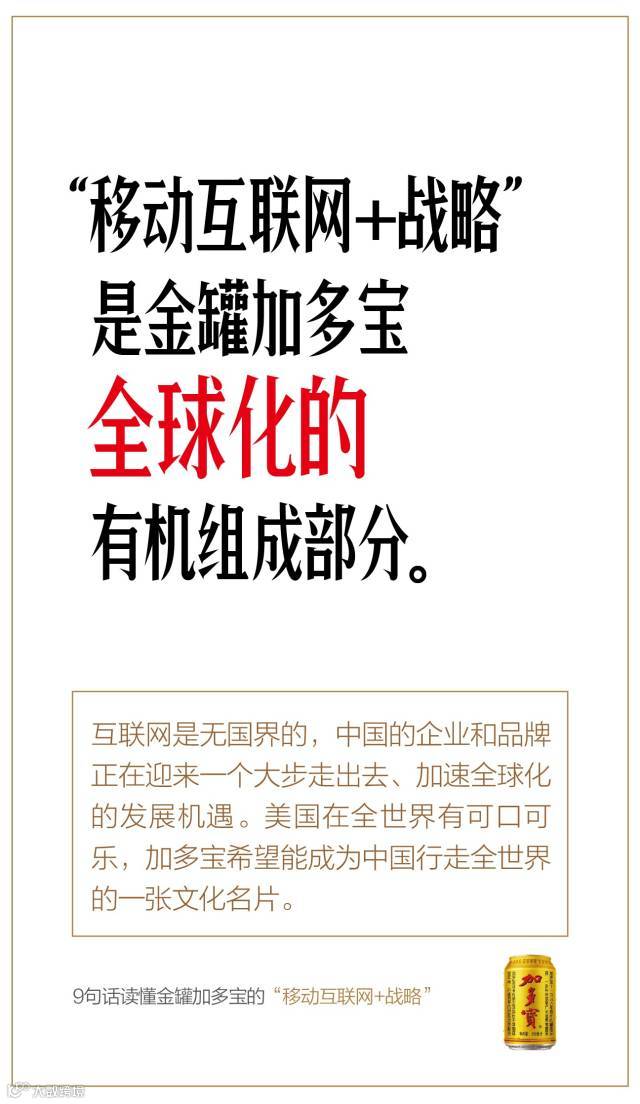 互联网是无国界的,中国的企业和品牌正在迎来一个大步走出去、加速全球化的发展机遇。美国在全世界有可口可乐,加多宝希望能成为中国行走全世界的一张文化名片。